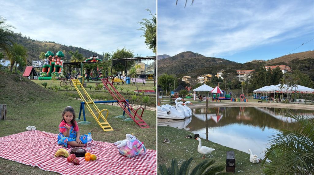 O parque oferece quadras de esportes, piscina, churrasqueira, lago com pedalinhos e área verde onde é possível fazer piquenique e brincadeiras com a criançada.