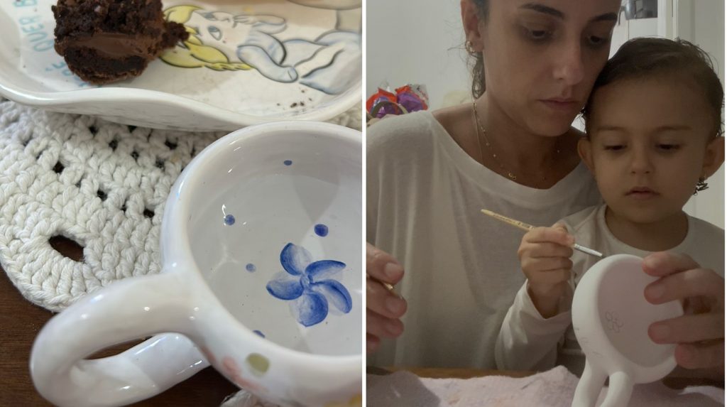 A primeira peça feita por Flor foi justamente essa canequinha — que ela mesma pintou com pequenas flores coloridas. Chegou até a usá-la em casa, antes que um “ pequeno incidente causado pelo pai” colocasse fim à breve vida da peça. “Mas tudo bem, ela já está na quarta caneca”, brinca a mãe.