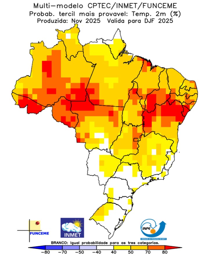 E se depender deste verão, 2026 também pode entrar para a lista. Isso porque o mapa de climatologia, produzido pelo CPTEC, INMET e FUNCEME, indica temperaturas mais altas do que as médias anteriores.