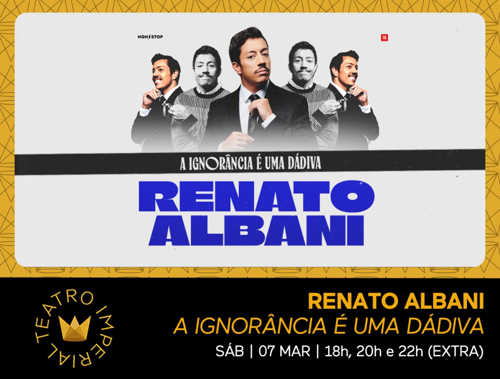 Prestes a fazer 40 anos de idade, Renato Albani se depara com as mudanças que chegam com o amadurecimento. Um dos maiores comediantes do país confessa escrever o melhor roteiro da carreira que já diverte o público em turnê com ingressos esgotados e sessões extras. Finalmente, o espetáculo ganha um nome: ‘A Ignorância É Uma Dádiva’.