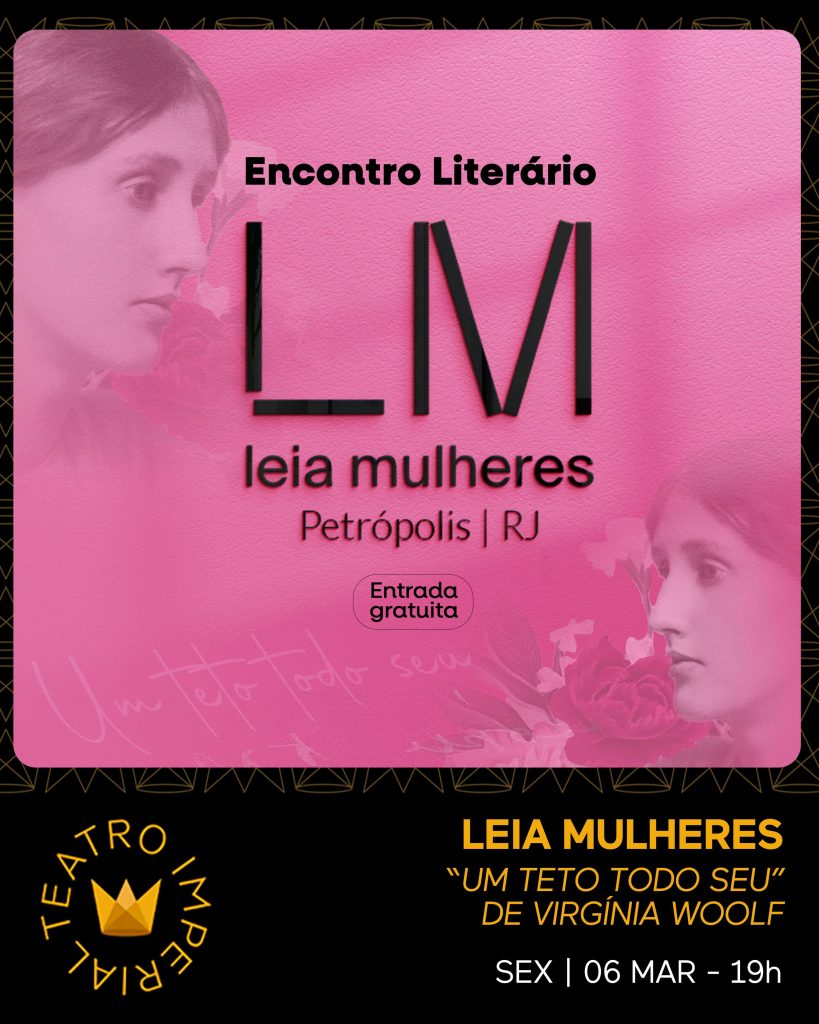 No dia 6 de março, o grupo Leia Mulheres Petrópolis, que articula leitura, reflexão crítica e conexão com o universo teatral, promove um encontro no Teatro, que vai trazer para o debate trechos da obra “Um Teto Todo Seu”, de Virginia Woolf. A atividade tem entrada gratuita e começa às 19h, com abertura da casa uma hora antes, para o público desfrutar do Foyer Jazz Café.