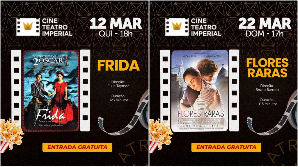 Com entrada gratuita, o Teatro Imperial agora promove sessões de cinema com exibições em 35mm, formato similar ao período clássico do audiovisual. Na quinta-feira (12), às 18h, será exibido o filme “Frida”. Já no domingo (22), às 17h, será exibido o filme “Flores Raras”.