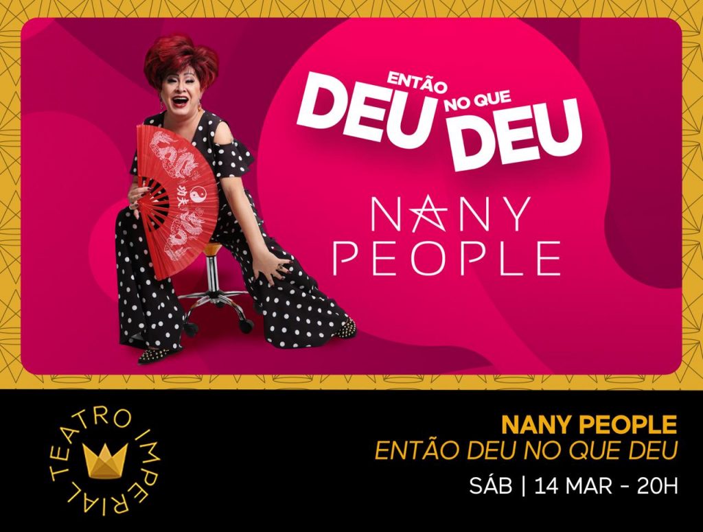Nany People está em cartaz com “Então… Deu No que Deu”, um espetáculo que reúne trechos de seus três solos de stand-up atualmente em cartaz em todo o país: “Nany é Pop!”, “Sob Medida” e “TsuNANY”. Uma oportunidade única de se divertir com o melhor da humorista mineira, que conquistou o país com seu talento e irreverência.