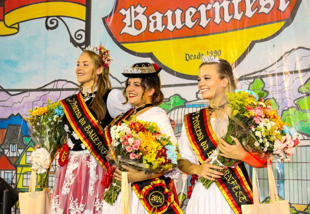 Anne Diehl, Lívia Dias e Thayná Matos são respectivamente a rainha e 1ª a 2ª princesas da Bauernfest 2026. A realeza da 37ª edição da Bauern, que celebra a colonização alemã na cidade, foi eleita nesta segunda-feira (16/03), durante um evento realizado no Palácio de Cristal. A Bauernfest acontece este ano de 19 de junho a 5 de julho.