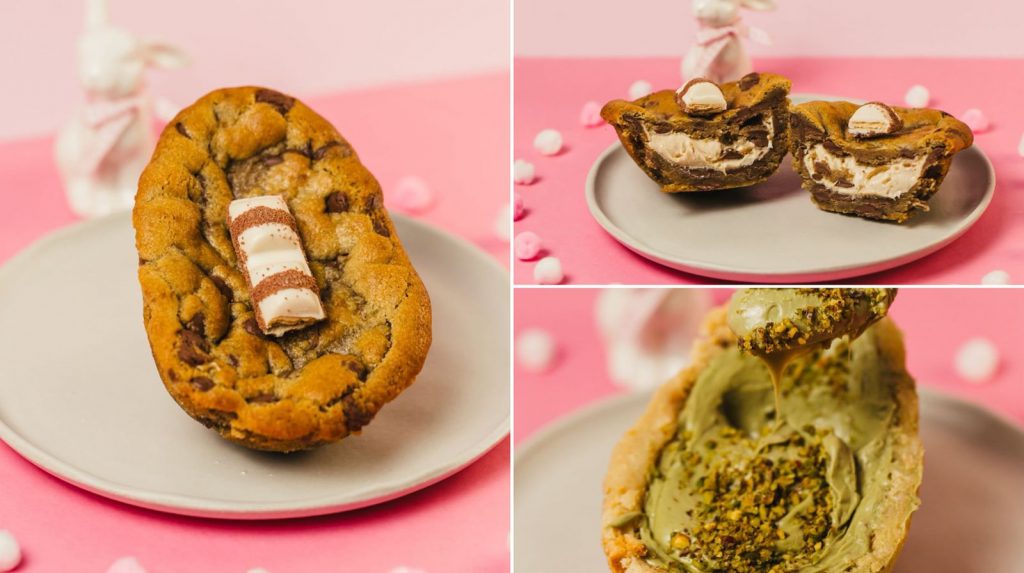 Opções de produtos para a Páscoa: destaque para ovos recheados com casca de cookies, potinho com mini cookies, kit com 12 mini brownies, ovo cookie com creme de kinder e ovo de brownie branco com pistache.