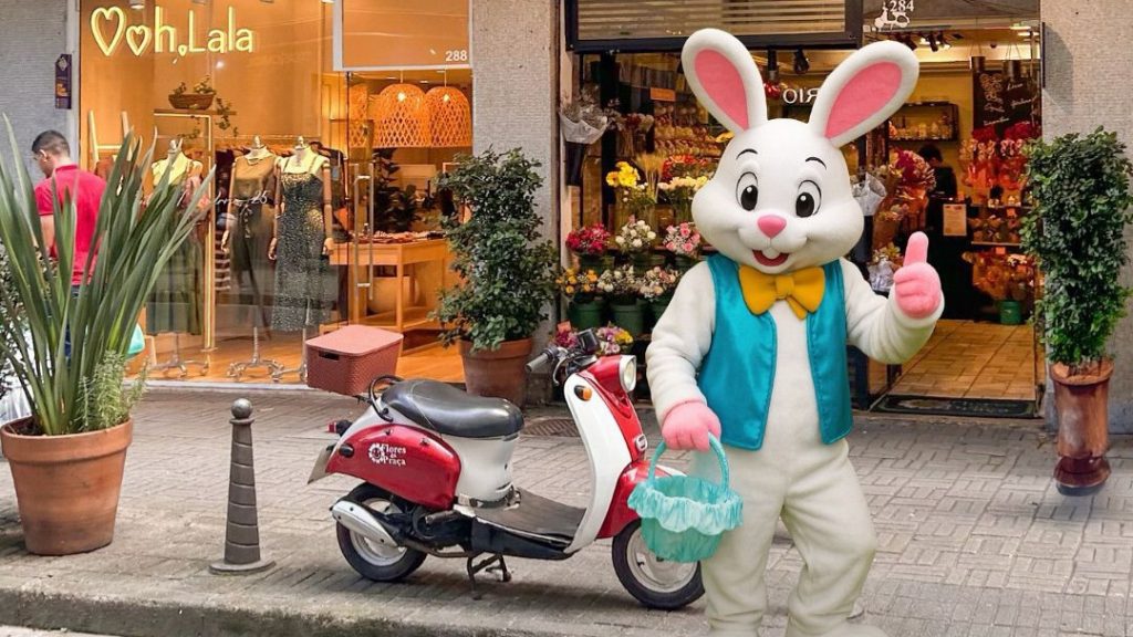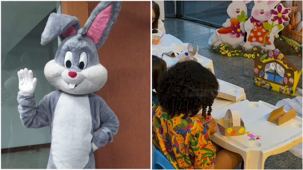No sábado (4), a partir das 15h, acontece a caça aos ovos, fotos com o coelhinho e outras brincadeiras. E no domingo (5), terá uma oficina de máscara de coelhos, das 13h às 17h, e teatrinho logo depois.