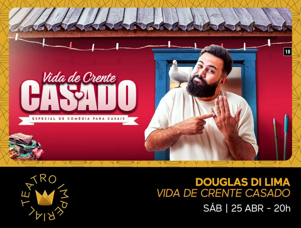 Douglas di Lima apresenta “Vida de Crente Casado”, um show solo de humor que transforma a vida a dois em gargalhadas sinceras. Com seu estilo irreverente, observador e cheio de identificação, o comediante compartilha histórias e situações do cotidiano do casamento cristão, mostrando que amar também envolve paciência, diálogo, fé… e muito bom humor.